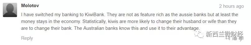有的网友则表示已经换到Kiwibank了,“虽然功能少点服务差一点,但至少钱是留在本国的经济体里。” “新西兰人换银行很懒,换老婆(老公)更频繁一些,澳洲银行充分利用了这一点。”