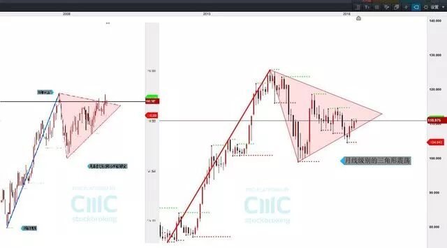 右侧为日元2011年以来月线图,技术上上非常清晰的三角形收敛,当前日元汇价处于收敛的边缘阶段;将此周期缩小至日线,会发现,日元对比18年3月底至5月底至今也是一个清晰的三角形收敛震荡。