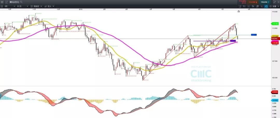日元汇价下破111.5后,做实108.11(5月29日)— 113.18(7月19日)的波段调整,回撤留意110.55—109.9水平区域的支撑。