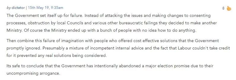 The Government set itself up for failure. Instead of attacking the issues and making changes to consenting processes, obstruction by local Councils and various other bureaucratic failings they decided to make another Ministry. Of course the Ministry ended up with a bunch of people with no idea how to do anything.