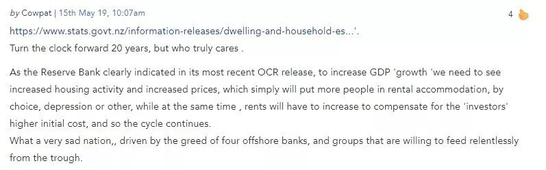 正如储备银行在其最近的OCR发布中明确指出的那样,为了增加GDP“增长”,我们需要看到住房市场的活跃和价格上涨,这将使更多的人不得不住进出租房屋,而在同时,租金必须增加,以弥补“投资者”更高的购买成本,并且周而复始。