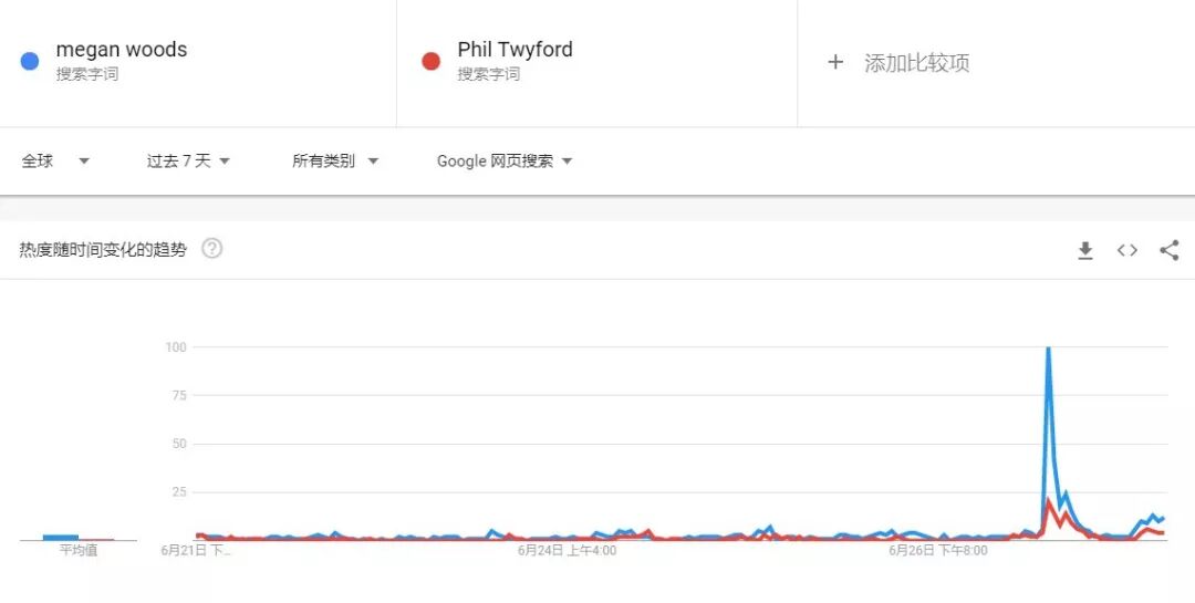 谷歌趋势上的数据可以发现,消息公开后搜索Megan Woods的人数暴增。