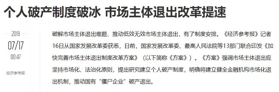7月16日,中国证券报旗下的“中证网”报道说:今年下半年,个人破产制度有望在个别地区启动试点!