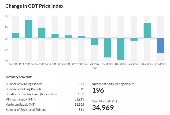 全球乳品贸易拍卖会上乳制品价格下跌,在过去六次拍卖中第五次下滑,GDT价格指数较三周前的拍卖价下跌2.6%。平均价格为每吨3,253美元,而三周前为每吨3,412美元。三周前售出的产品约为34,969吨,高于25,000吨。