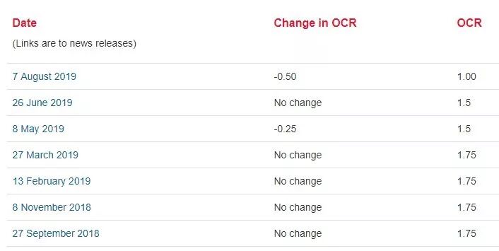 新西兰央行下调OCR至1%