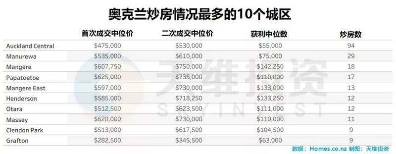 其中Manurewa炒房获利中位数为7.5万纽币;Mangere炒房获利中位数为奥克兰最高的14.225万纽币;Papatoetoe炒房获利中位数为11万纽币;Mangere East炒房获利中位数为13.3万纽币。