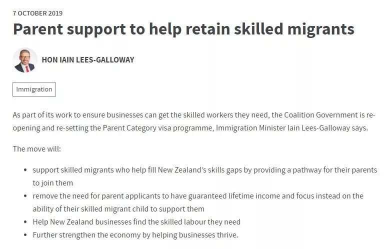 新西兰移民部长Iain Lee-Galloway今早(10月7日)表示,新西兰联合政府正在重新开放并重新设置父母团聚移民类别签证,这是为确保企业能获得所需技术工人工作的一部分。