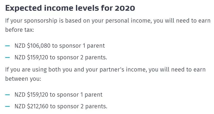 年收入需要达到新西兰收入中位数的两倍(现为10.6万纽币)才能担保一位父母(爹或者妈或者岳父、岳母),如果想要担保两位父母,年收入则要达到新西兰收入中位数的三倍(现每年15.9万纽币)。