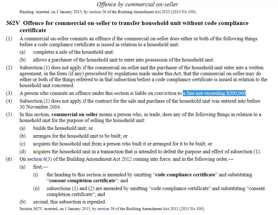 在新西兰,开发商出售没有CCC的房产是违法行为。