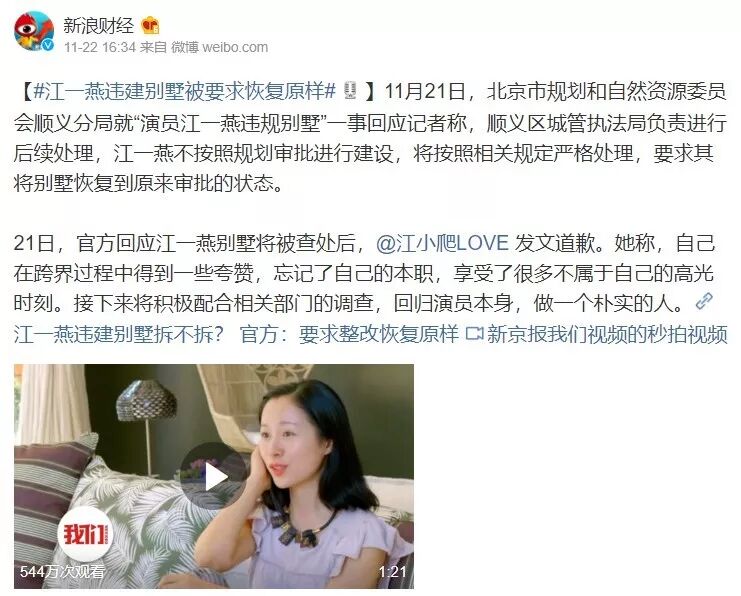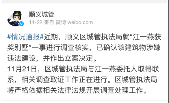 11月21日,顺义城管执法局日前发布情况通报称,该局已于近日就“江一燕获奖别墅”一事进行调查核实,已确认该建筑物涉嫌违法建设,并作出立案决定。