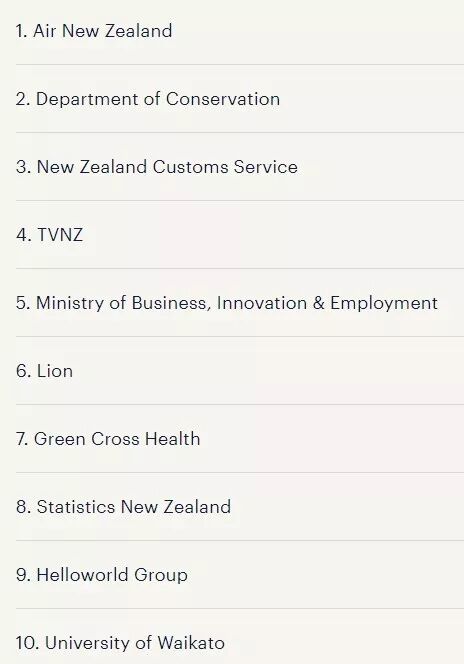 2019年,新西兰10大最具吸引力的大型雇主如下:
