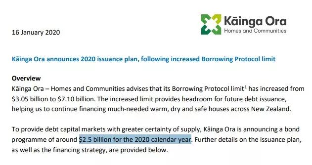 Kāinga Ora的子公司Housing Housing New Zealand Limited(HNZ,新西兰工屋署)计划在2020年发行约$ 25亿纽币的“健康债券”。