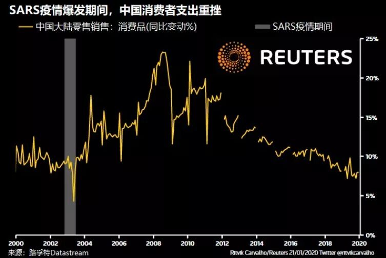 历史数据上,当年SARS疫情爆发期间,由于消费者支出受挫,中国零售销售数据出现了大幅下降。