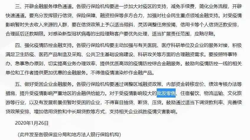 1月26日,银保监会发布了《关于加强银行业保险业金融服务,配合做好新型冠状病毒感染的肺炎疫情防控工作的通知》。