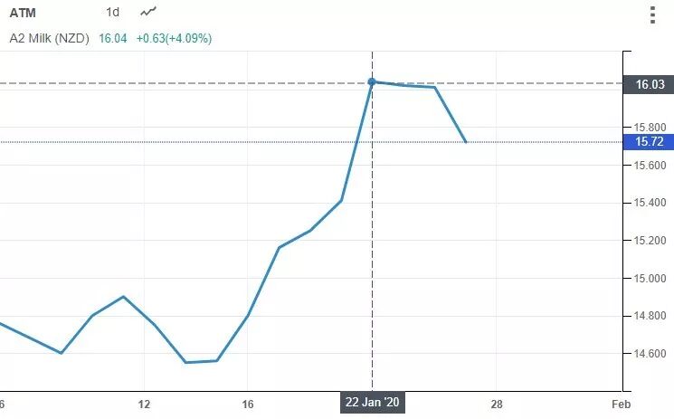 另一方面,在股市,新西兰版“小茅台”的A2 Milk股价也受到了波及,目前股价已经从最高点的$16.01回落至$15.72。
