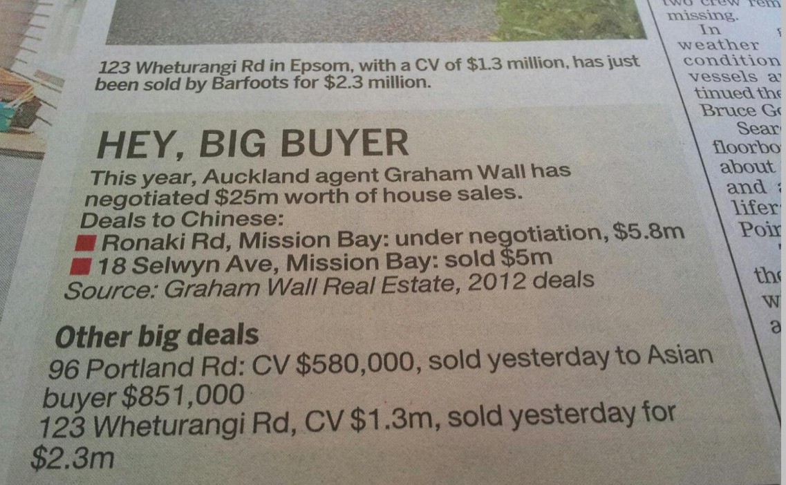 天维网5月4日报道 援引英文先驱报消息 有钱的海外买家将新西兰的房产推向高位。 房产中介Graham Wall讲到,他刚卖出了两栋Mission Bay的两处房产给中国人,本月底他亦将前去上海做进一步的工作。 他表示,