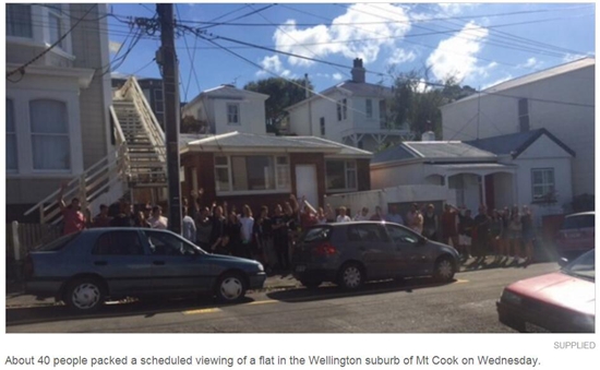 周三有媒体报道称,惠灵顿出租房紧缺的状况并未有丝毫缓解,市内的Mt Cook甚至出现40人排队看房的景象,并拍下照片。一名中介经理称这一幕犹如“街头派对”。