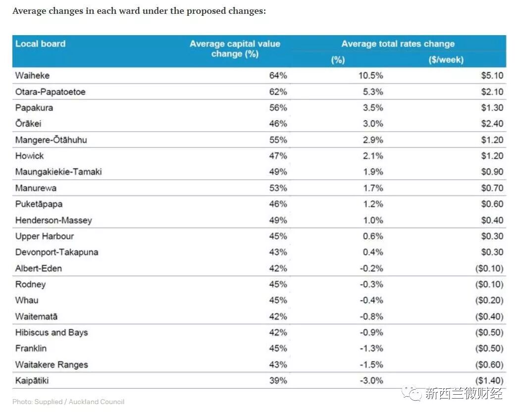 关键的是媒体刊出的下面这张表格。上面写的提供方是奥克兰市议会。 这张表详解了奥克兰各选区的地税预期涨幅情况: 其他涨幅较大的地区也以奥克兰东南区为主,因为奥克兰东南区房价基数低,2017版地税涨幅高,所以税收也增加快。 而基数较高的北岸、中区,因为2017版地税涨幅小,所以税收增幅也少。 比如北岸Devonport-Takapuna选区,3年房产增值43%,地税涨幅0.4%,摊到每周涨幅约0.30元,增幅不大。 所以,3.3万房主地税涨幅超过10%,1.9万减少超过10%,总体还是控制不错的。(去年Phil Goff市长承诺地税涨幅控制在平均2.5%之下)
