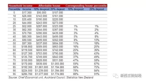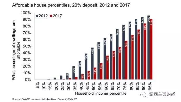 研究发现:2017年,一个收入处在奥克兰中间位的家庭(100个家庭中的第50个),如果首付10%的话,其家庭收入可以养得起11%的房产,如果首付20%的话,其家庭收入可以养得起18%的房产。
