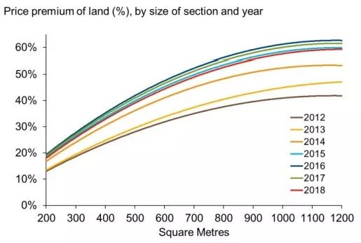 从2012年到2016年,这一比例对于200-1200平米土地房产来说都是在增长的,然而,到了2017和2018年,这种增长出现了变化,出现了下降。