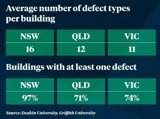 澳洲两所大学的研究发现,新南威尔士(NSW)有97%的建筑至少有一项缺陷,平均一套房产有16处缺陷。